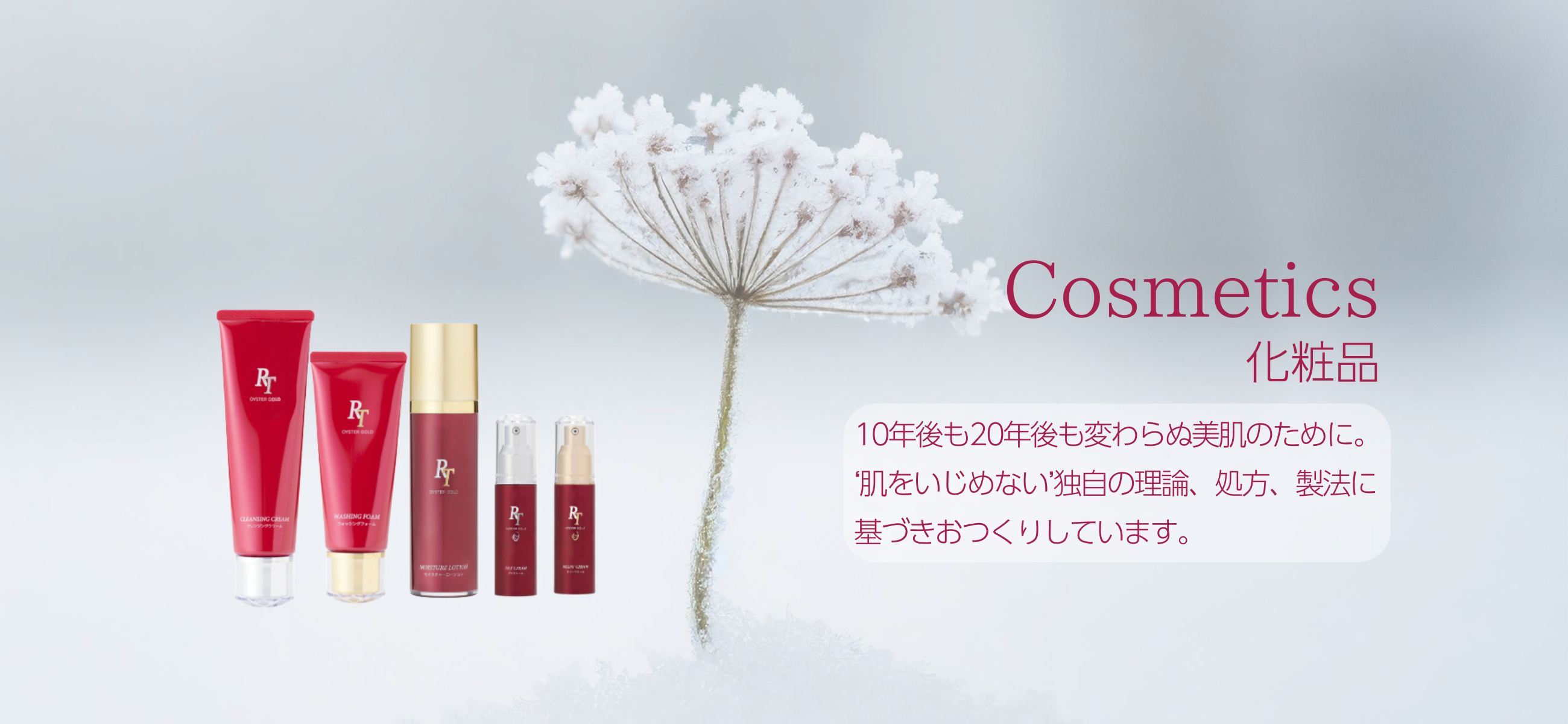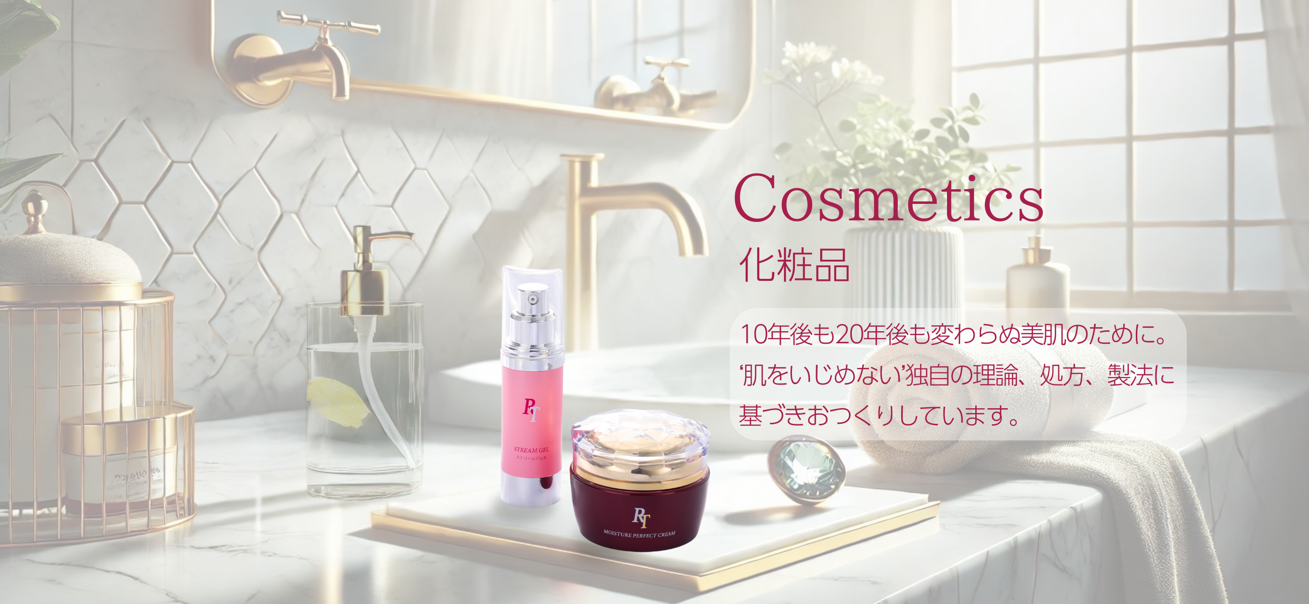 RT化粧品は、自律神経など体の機能面にも考慮し、肌に負担のかからない安心できる成分を吟味処方し精製を重ね不純物を取り除き自らのもつ美肌づくりの力をサポートいたします。