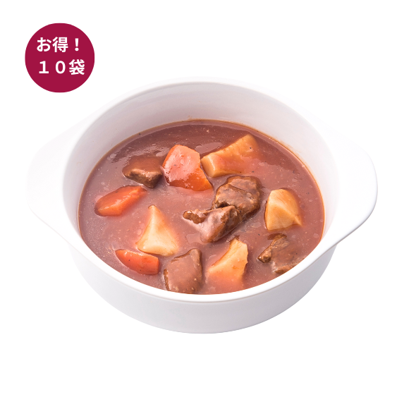 厳選した和牛モモ肉とジャガイモ・ニンジンをじっくり煮込み、素材の旨みを丸ごと閉じ込めました。一袋ごとに丁寧に手詰めすることで、和牛と野菜がバランスよく入り、仕上がりに安定感があります。和牛の柔らかさ、野菜のホクホク感、奥深いソースのコクが一体となり、日常の食卓にも満足感を添えます。