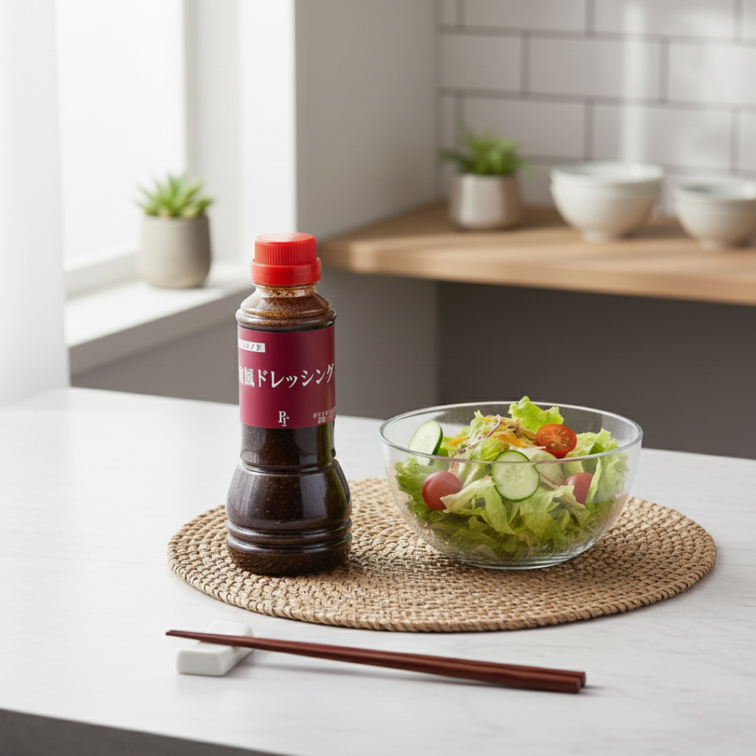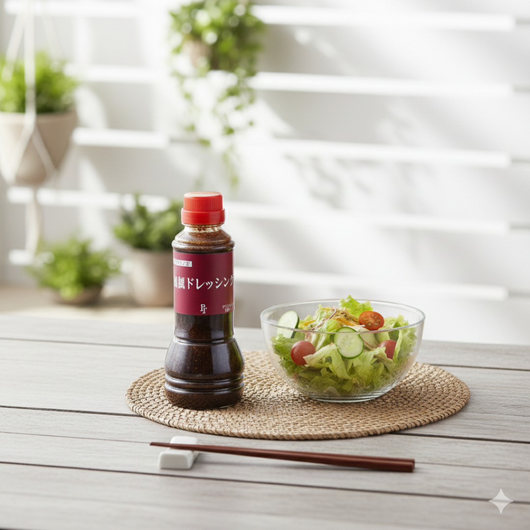 しょうゆとごまの風味を活かし酸味と甘味の絶妙なバランスが素材の味を引き立てます。サラダにはもちろん、ハンバーグに和風ソースとしてさっぱりと…等あると重宝します。